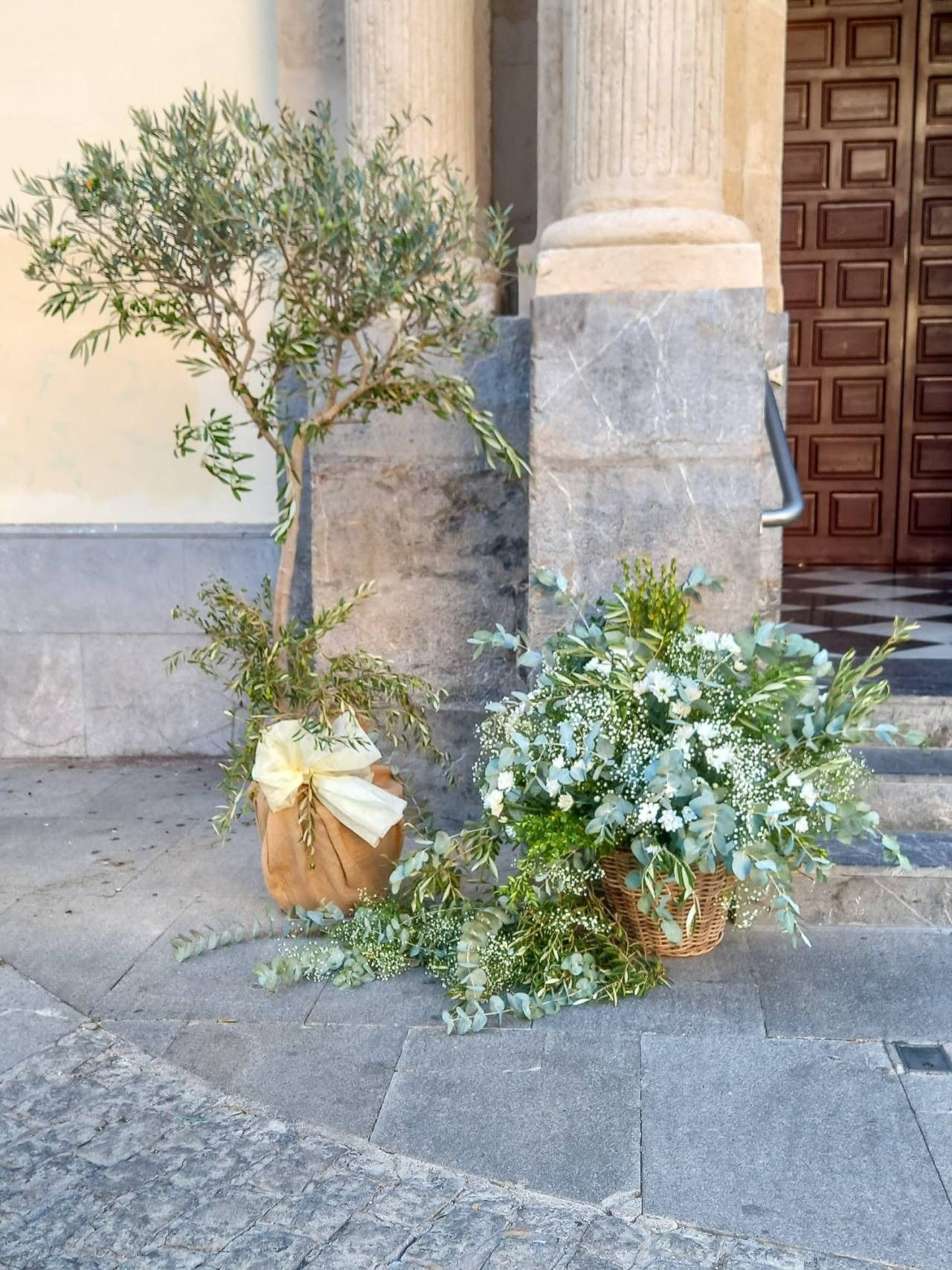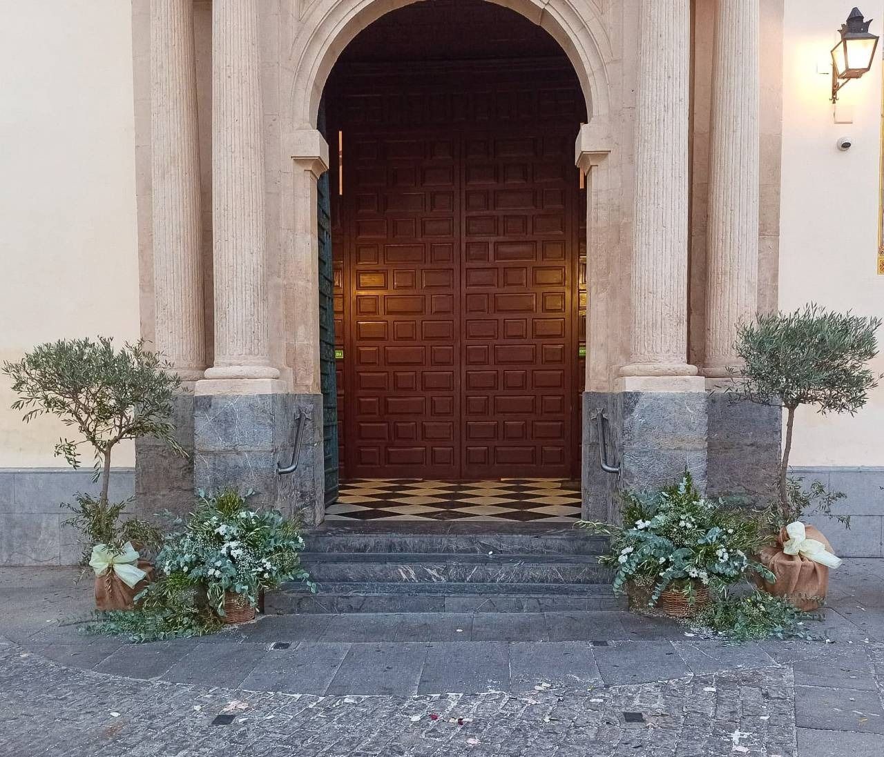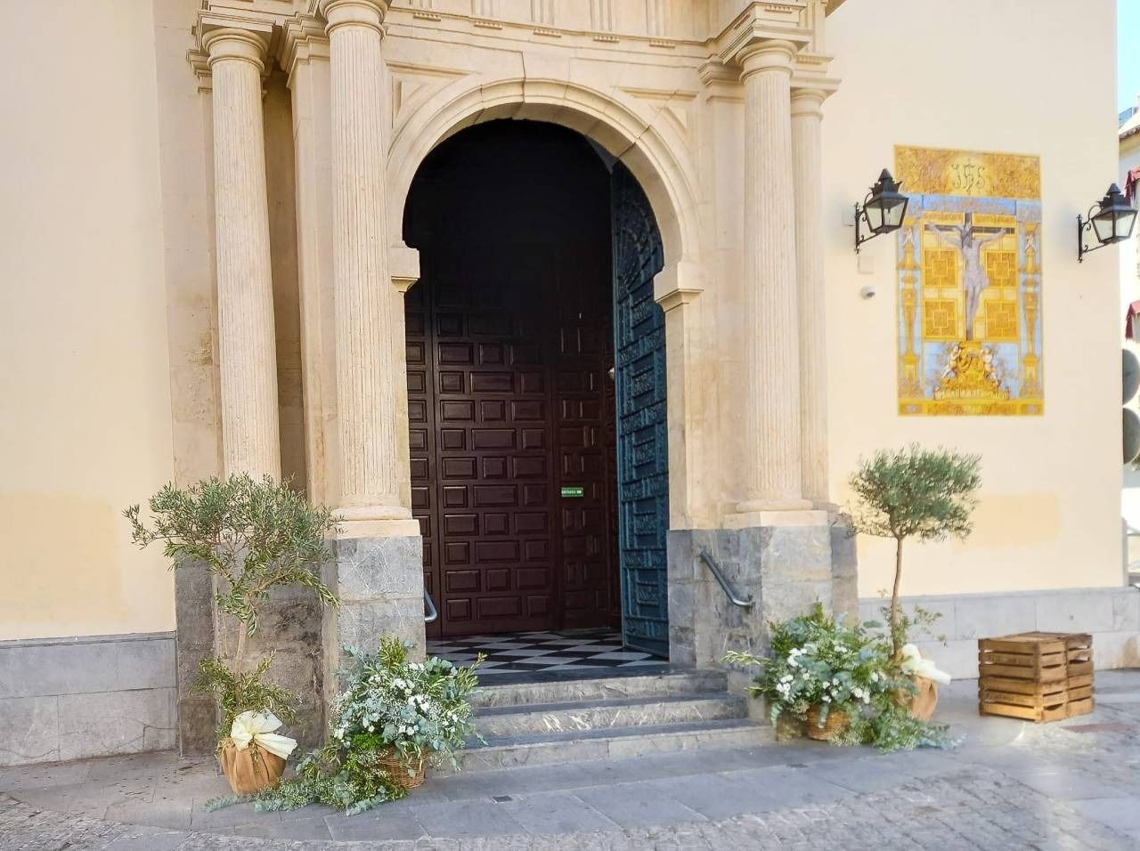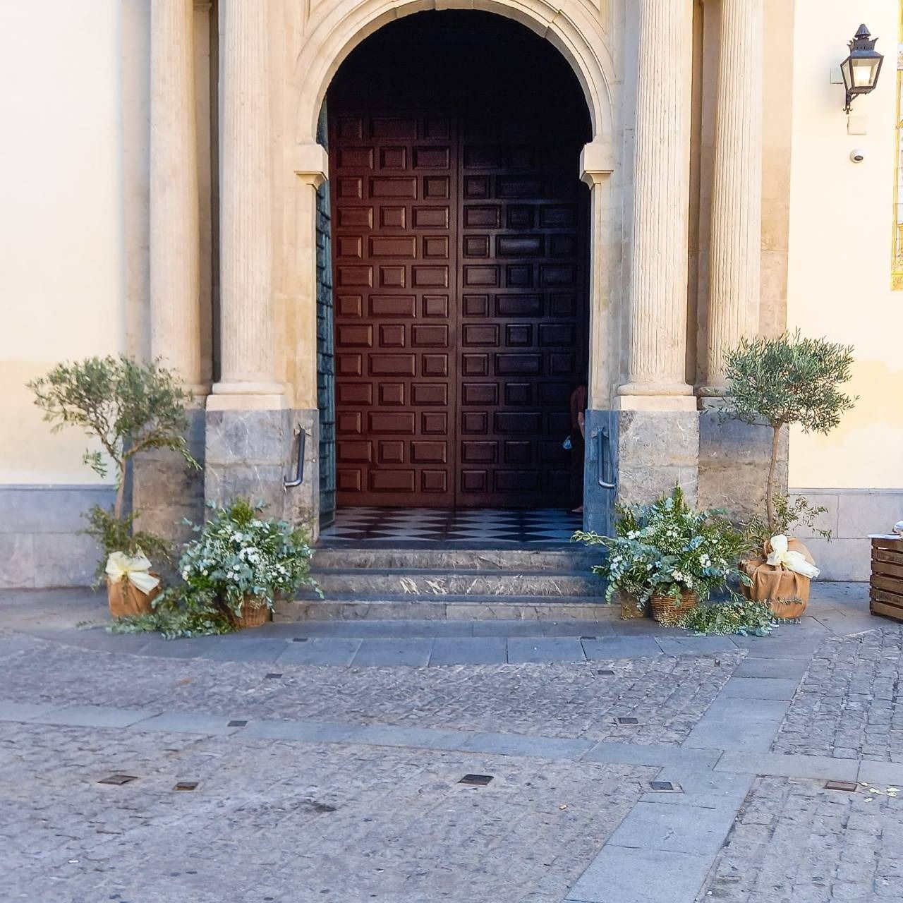 En este arreglo para la Iglesia de la Trinidad estrenamos nuestros olivos de bola, que resaltan su hermosa portada.